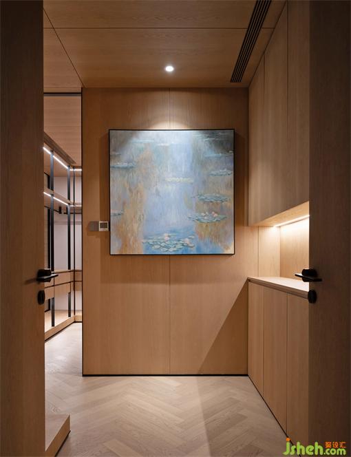 主卧玄关选了《池塘·睡莲》挂画,睡莲开在水里将自己的枝叶从容地向天空舒展,它们没有任何地纷扰,也没有任何地忧虑,在静谧的池塘中,仰望着头顶无尽的苍穹,似乎是一个空无且不可及的梦境。