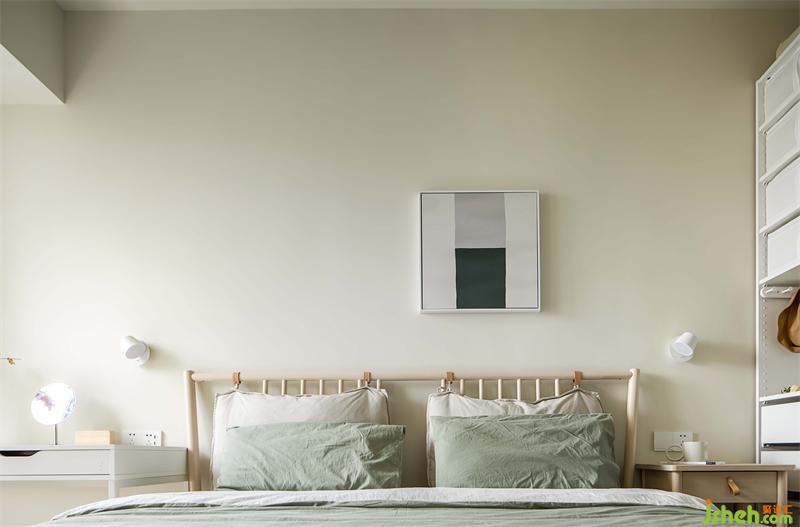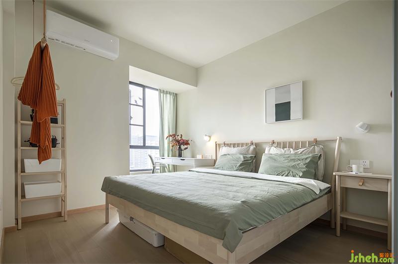 卧室,我们希望是轻盈而温馨的氛围。主卧的家具是屋主一起组装的,包括衣柜内部空间,是按需购买配件布置,随时可以变换的空间增加了生活趣味性和新鲜感。桦木皮革则是屋主喜欢的元素,材质本身的特质就能营造出轻盈自然感,软装上对颜色的调和使得整个空间更加和谐统一。