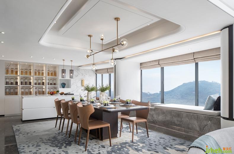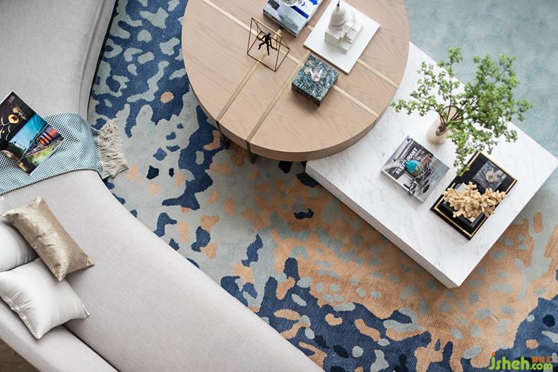 不规则的家具和艺术品于此巧妙邂逅,在比例、情绪和故事间平衡出了自由生动的韵味,处处贯穿恬逸和谐。优美的沙发弧线,木质与理石拼接的茶几构造,搭配浪花般活泼的地毯,色彩跳跃的布艺软装从客厅蜿蜒至餐厅,可谓到处皆意境,随时有物华,设计公司为空间增添耐人寻味的艺术内涵,引发海湾生活方式的无限思考与探索。