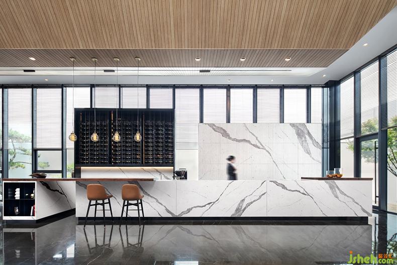 接待总台与水吧区合二为一,不同材质与纹理经过别出心裁的组合,凸显质感与品味。