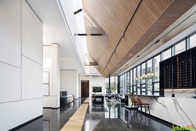 体验交流区天花突破常规做法,大尺度斜面的天花造型,蕴含接近黄金比例尺度密码,带来强烈的视觉冲击。温润的木质烘托出沉稳的亲和力,光自屋顶狭长的天窗曳洒一室,于整个空间弥散通透又不乏灵动的美。