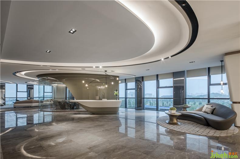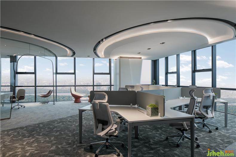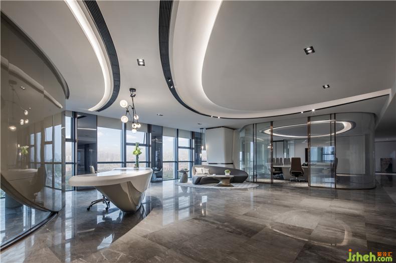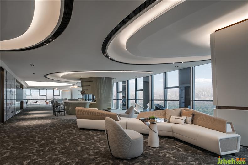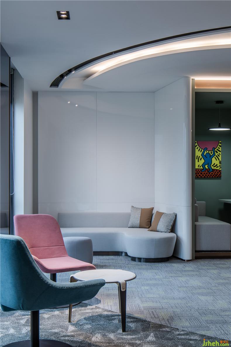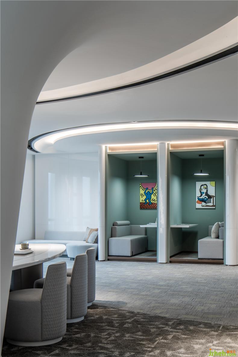 曲线,自由、多变,能为空间带来或轻松、或虚幻、或动态的感觉。办公室设计31设计在空间中应用了大量的圆弧线,为空间带来了奇幻的流动感,同时展现出办公空间鲜有的张力及未来式的时尚感,让人的空间体验更加丰富。