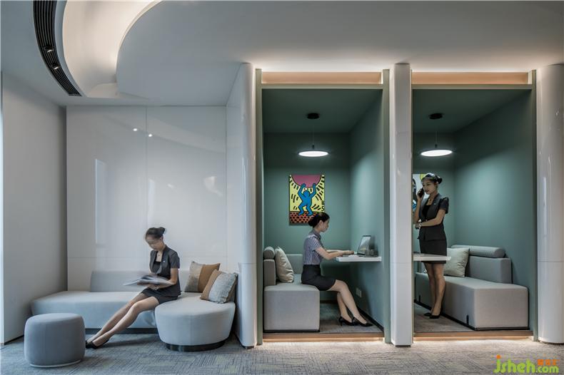 整个空间无隔档,墙体用玻璃代替,开放的办公区域,采用异形的多组合办公桌,自由多变,办公室设计这种灵活且完整的模式增加了工作的互动性,让人的精神放松,思维更加不受限。具有私密性的特色小隔间,是设计团队提出来新的私密模式解决方案,可作为两人的谈话空间,亦可作为接听电话的电话亭,保证工作不被打扰,且具有个人思考的空间,给人提供更为灵活舒适的办公体验。