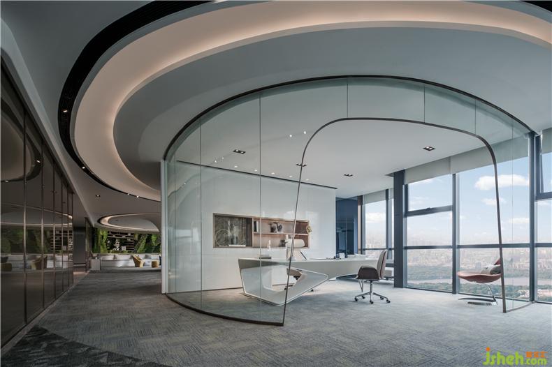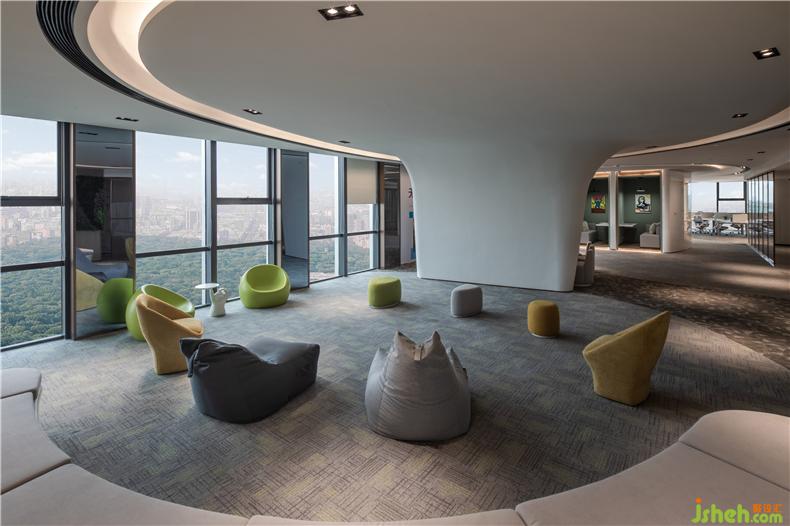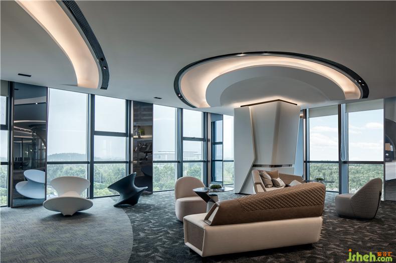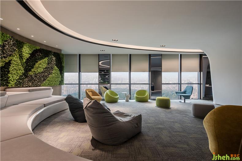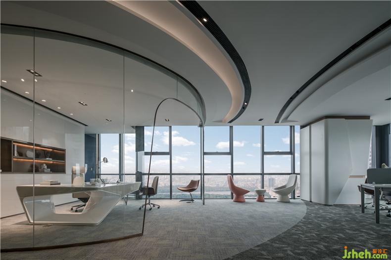 透亮的玻璃窗,争取自然光最大限度的渗透量,引进外景,城市的日与夜变成室内一幕,将城市之景尽收眼底。同时将独立办公室与开放办公区隔开,但又保留两者之间的互动性,拉近管理层与部门员工之间的距离,鼓励彼此在舒适自然的氛围中研究与讨论,收获信息,激发灵感,亦可在工作之余放松休憩。