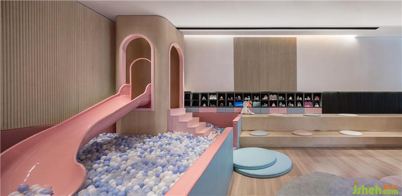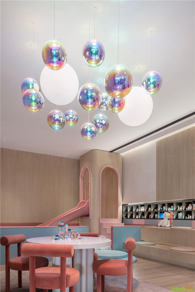 明亮柔和的色彩,丰富的童趣元素,多样的家具装置,多彩的泡泡吊灯,是儿童书吧区的亮点所在。粉色的滑滑梯,颜色各异的玩具球,书架上童书,同时满足了孩子的游戏娱乐和学习需求,在阅读和童趣的交流中收获成长。