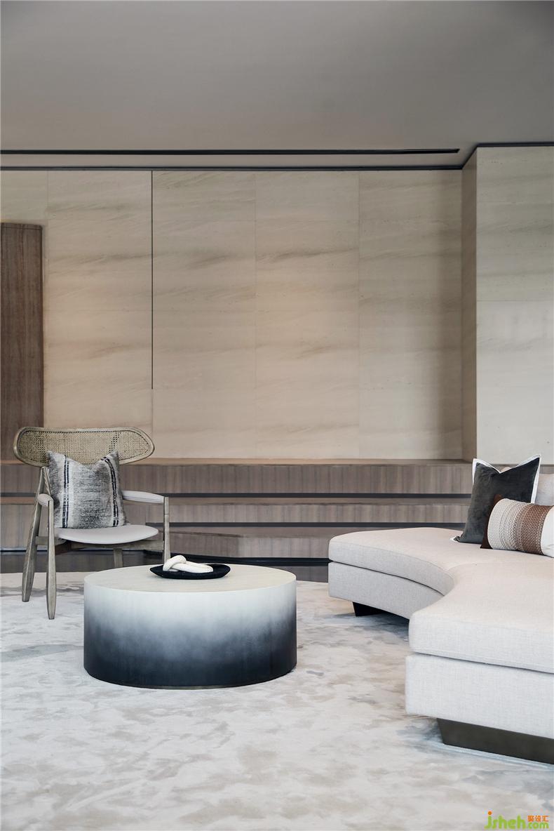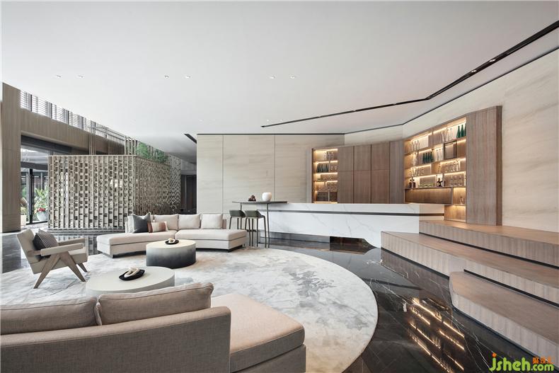 洽谈区是客人与销售人员的交流场所,灵感来源于乌镇错落有致的建筑与街道。散座散落在不同高度空间之中,嘉兴售楼处设计亲和与气度兼顾,深度洽谈区营造出屋中有屋的感觉,高度不同,体验感与尊贵感更佳。