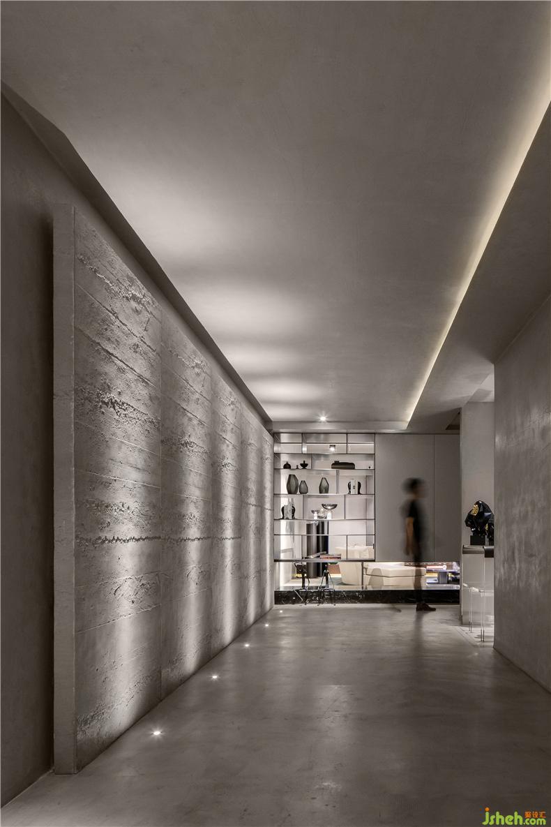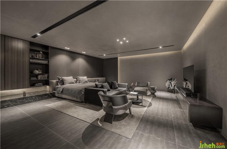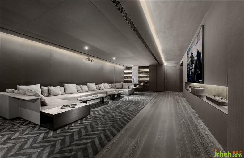 过道是卧室与客厅的承上启下的空间,为了减弱灰色带来的乏味,会所设计利用地灯的光影,打造沉静内敛的空间环境。