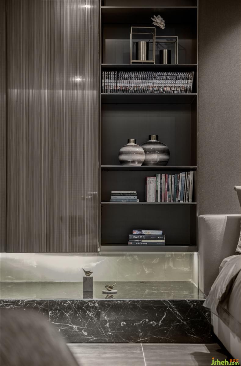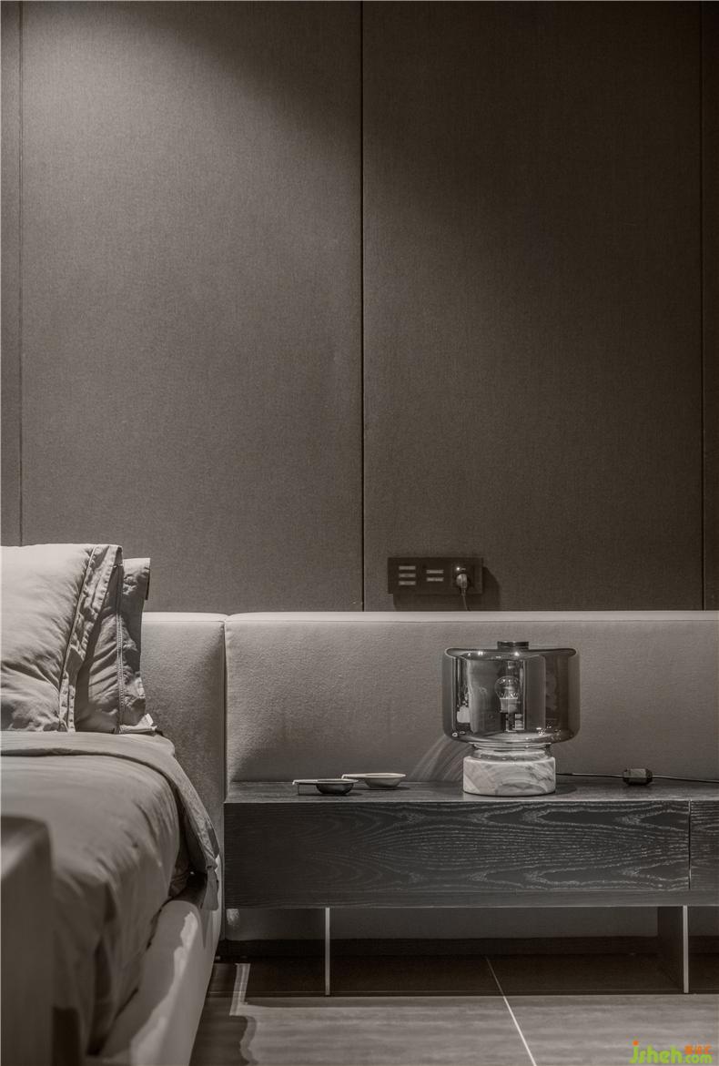 卧室床头的深色木纹柜,墙布硬包的比例分割,配上精致的玻璃台灯,设计细节的把控上堪称极致,处处都流露着精致的味道。