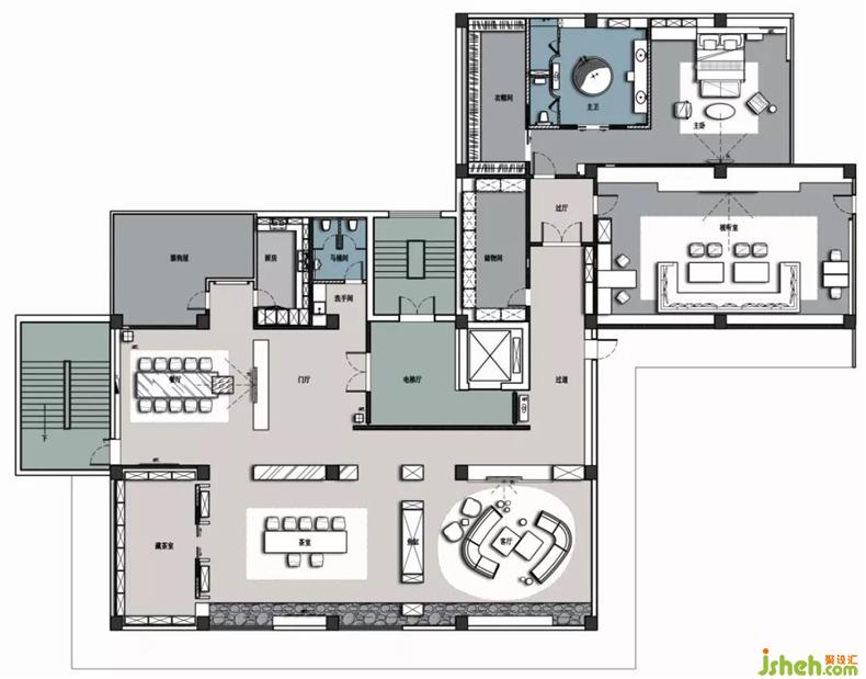 墙柜的镂空完美分割着墙面,冲破空间的局限;拉丝灰镜的柜面也为素雅的氛围带来了一丝律动。会所设计