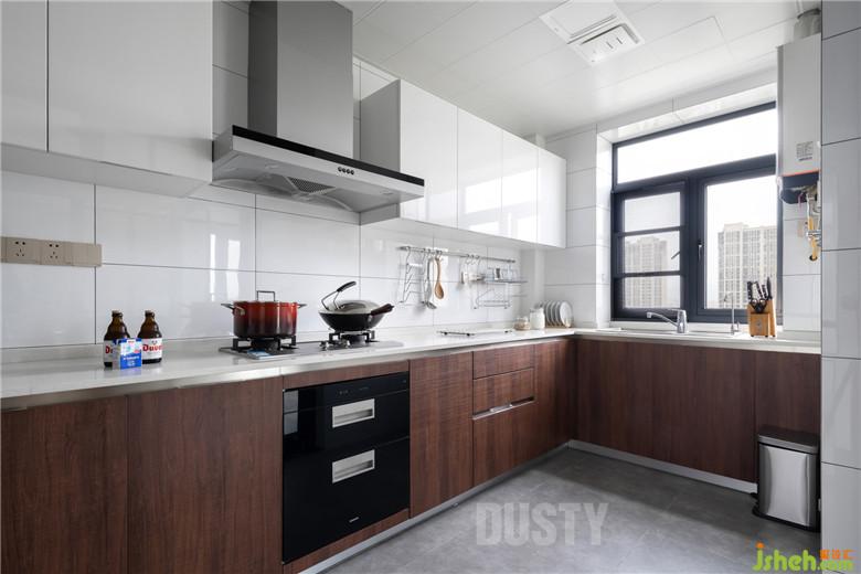 简洁流畅的线条,现代感十足的设计,室内设计师充分利用地柜与吊柜空间,将物品收纳到柜子里,空间干净,让人心感舒畅。