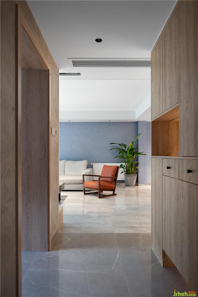 入户右手边实现通顶木质柜、便于存放随手零杂物品、换鞋等进出门需求。