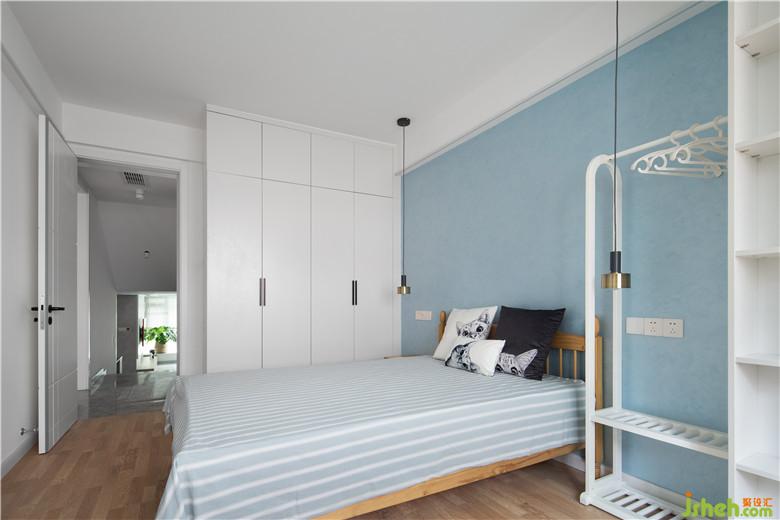 次卧是小孩房,室内设计师改造成他最爱的蓝色和猫,十分有爱的空间。床头旁的简便衣架,让脱下的衣物,有了归处。