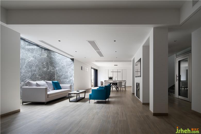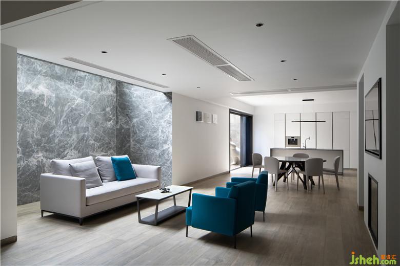 色彩上,蓝色的加入,与整体的灰白色调共同营造出轻奢的质感。