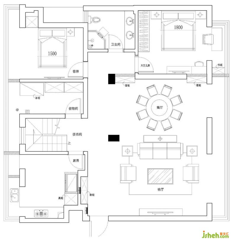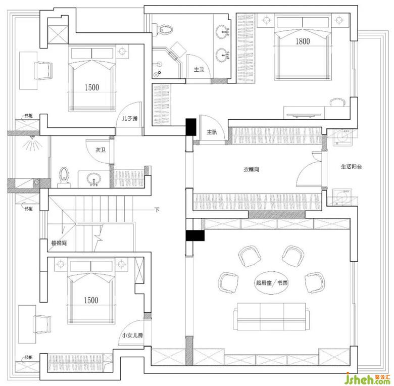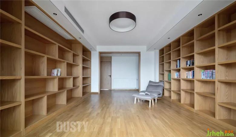 客厅顶上搭出的空间作为起居室兼书房,它们之间的通道设计为衣帽间区域,不多占用空间的基础上,满足收纳功能。