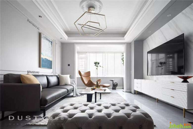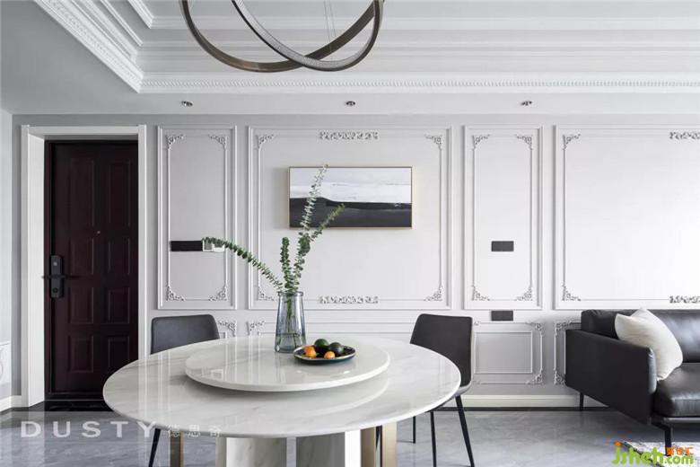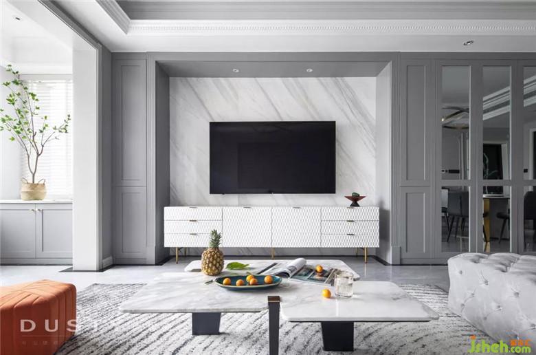 客餐厅一整面的组合柜,电视背景墙的大理石艺术纹理搭配的灰色拼框柜门造型,点亮了日常里的精致细腻。