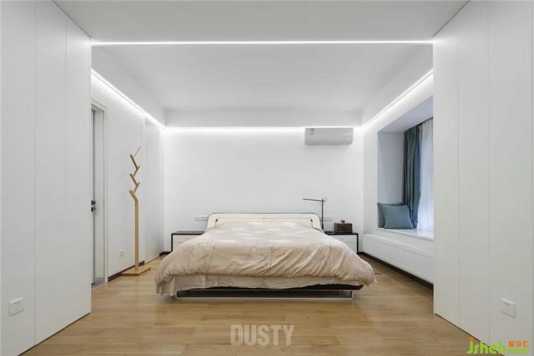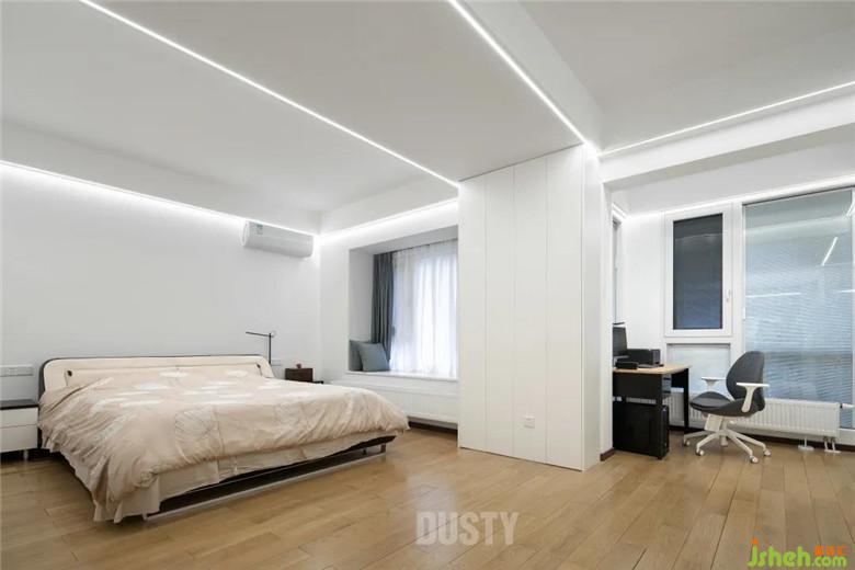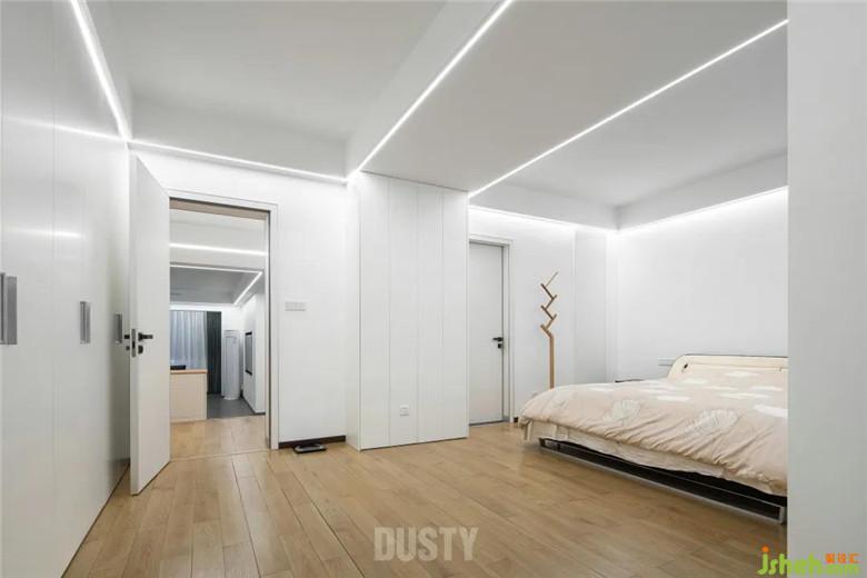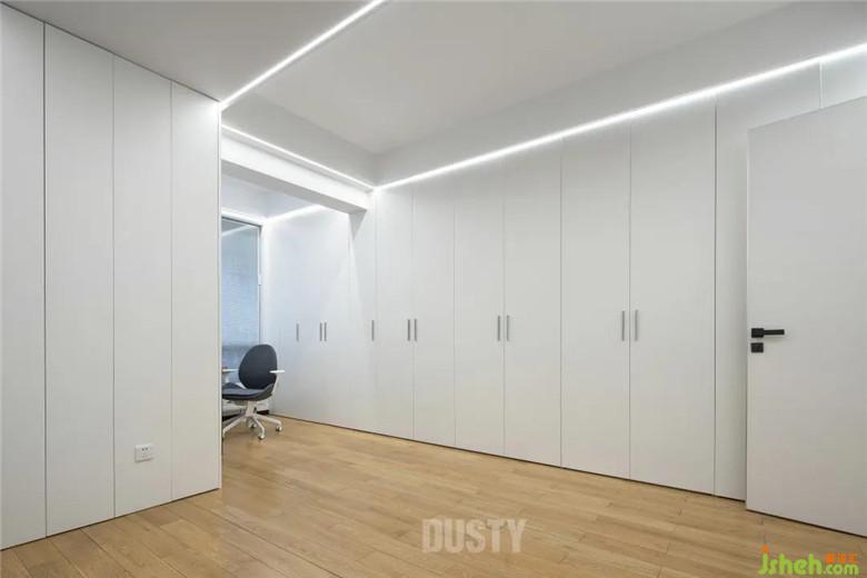 主卧房门装修公司改为朝向客厅,使之南北空气形成对流。整个空间无多余的造型,满墙衣柜从地到顶无接缝,空间得到最大释放,收纳功能做到最大化。