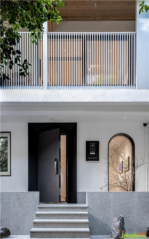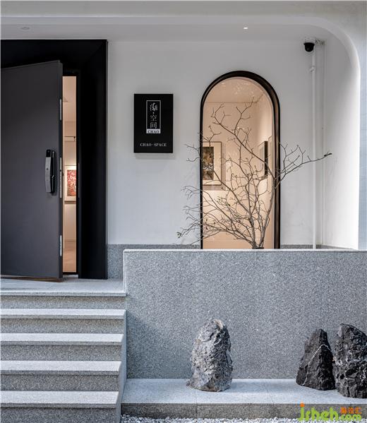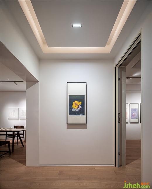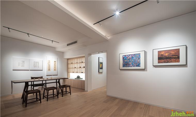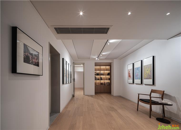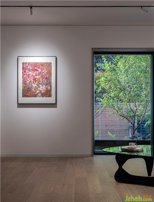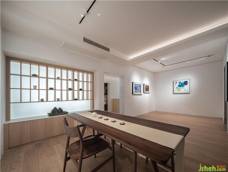 我们拆除了部分墙体,重新规划了布局,一层以展示作品为主,也兼部分接待的功能,原来的厨房改为一个操作间,把会客功能放在能看到花园的区域,展厅设计运用传统园林的借景手法,使室内外有一个互动。它的二层,规划成业主的工作室、一个茶室、还有一个收纳画材的库房。