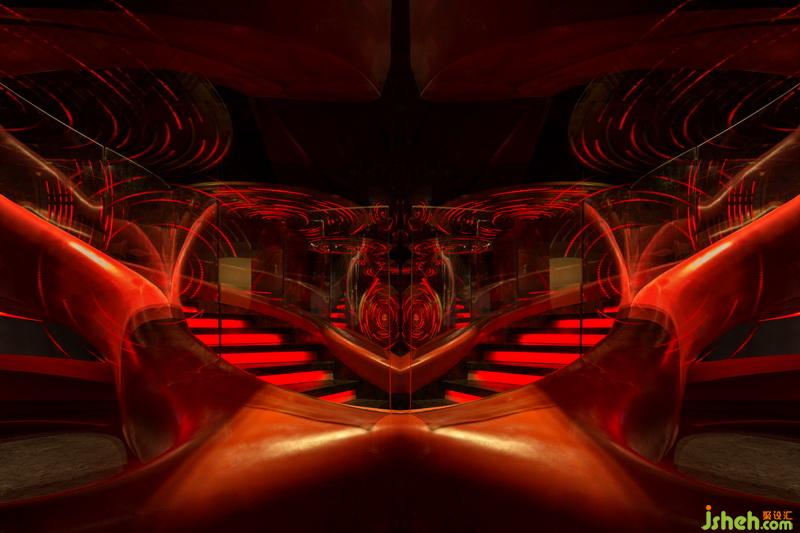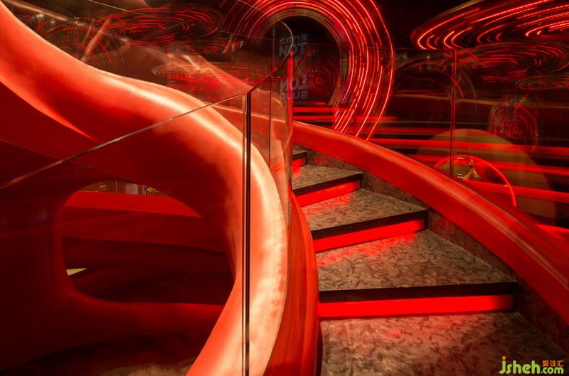 Lounge Bar连廊入口处,一条红色GRG异形旋转楼梯连接了二三层;它从地面盘旋而上,红色与光影的强烈对比形成虚拟未来感,带来极度的视觉震撼。