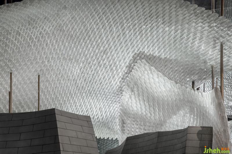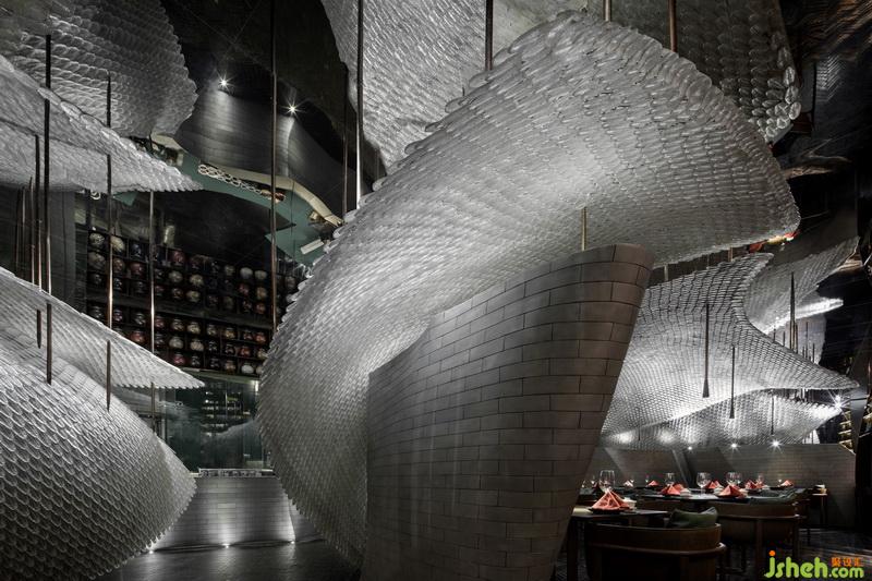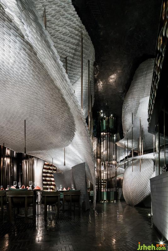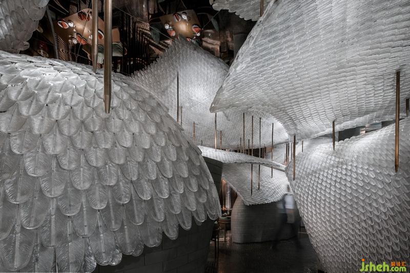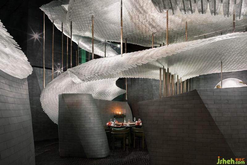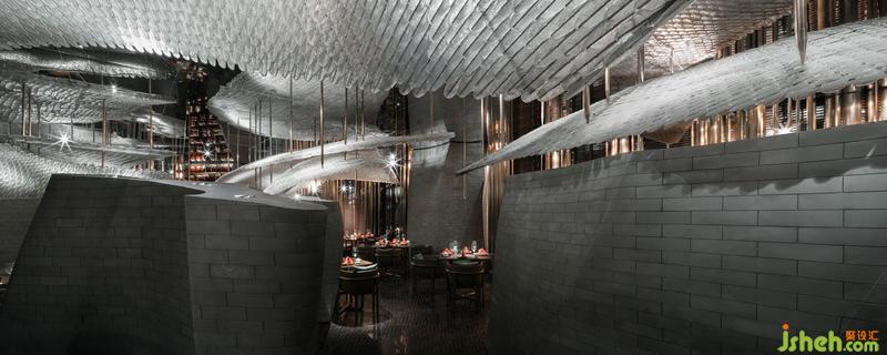 当体验者在餐厅中穿行时,空间逐渐由开阔变得狭隘、辗转曲折;能够近距离接触羽毛,其经过高温浇注而成的羽毛在指尖上滑过,留下余温,其触感带我们体验所经历的一切;琉璃羽毛,一柔一刚,灵动,闪耀。不锈钢的砖墙,无缝,坚硬,光滑;拼贴的砖块地面,岁月的痕迹,体块的穿插让内部富有活力。