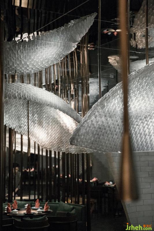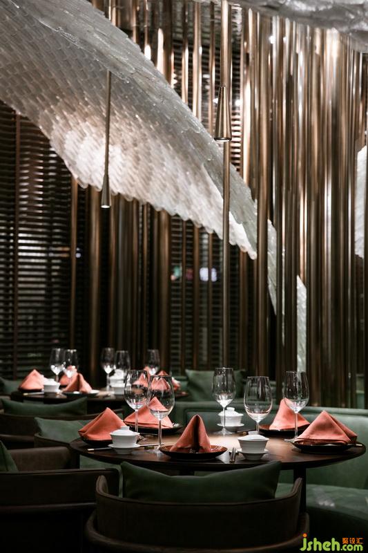 铜柱承载着琉璃羽毛,掘地而起直冲天际;在天花镜面的倒影下,仿佛穿越时光的对话。墙面的镜面又在横向维度上把空间扩大了一倍,如此让整个空间像羽翼般的梦境一样无界。我们希望客人能够感受到置身在梦境之中,扑朔迷离,形成独特的空间体验。