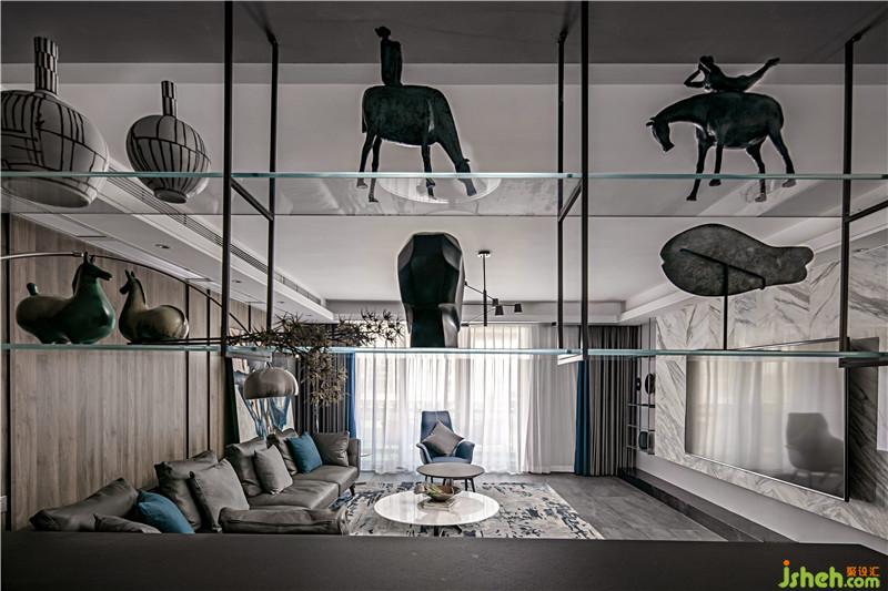 客厅左边设计了玻璃金属层板与进门口鞋柜上方的玻璃层板呼应。