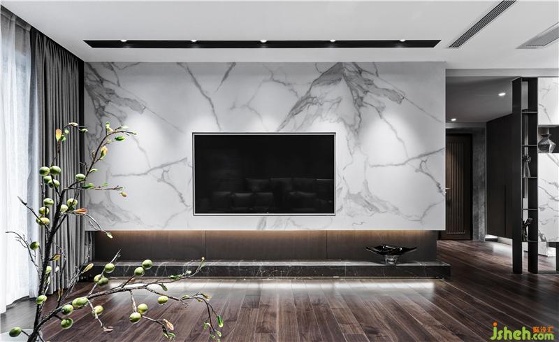 设计的概念从玄关自然地延伸到客厅,以原木为主材质,风格清丽,结合地毯、大理石山水纹理形态,以及植物色彩、动物元素,共同营造出这样一个轻松舒适且带有呼吸感的空间环境。室内设计师