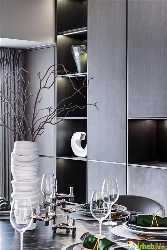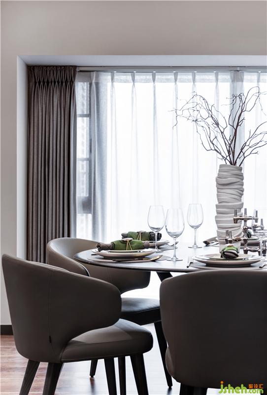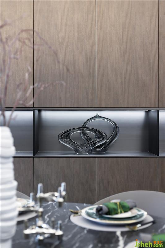 餐厅的花器、餐具、摆件,乃至餐桌座椅,都以流动性的纹理,结合石木材质,在设计主调上,诠释优雅的品质生活。
