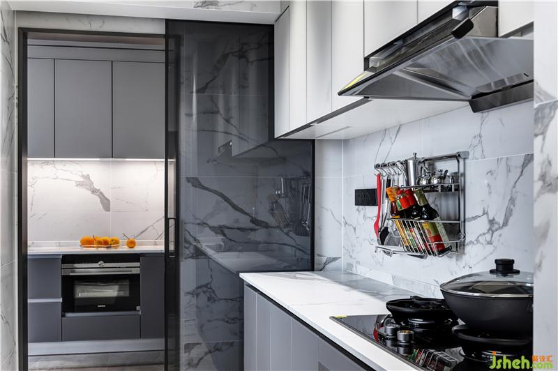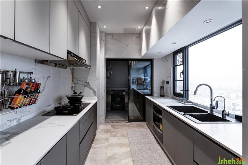 厨房的设计大胆的采用了玻璃窗面,让视野更具开阔性,而选色与材质,都秉持简单纯粹的原则,让室内与室外形成反差,虽然放眼望去是高楼林立,但还是让人仿佛置身于自然浪漫的别样空间。