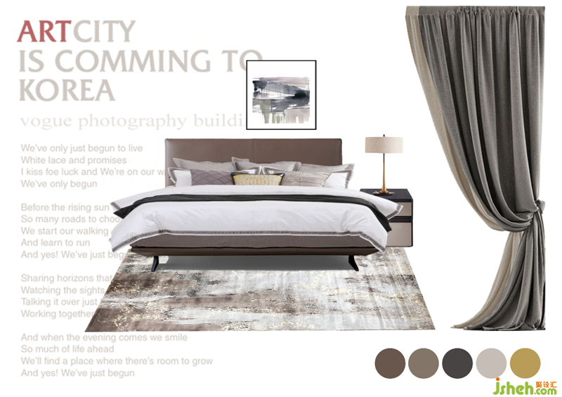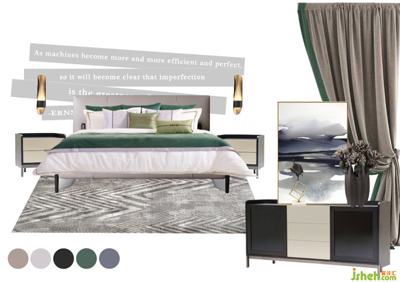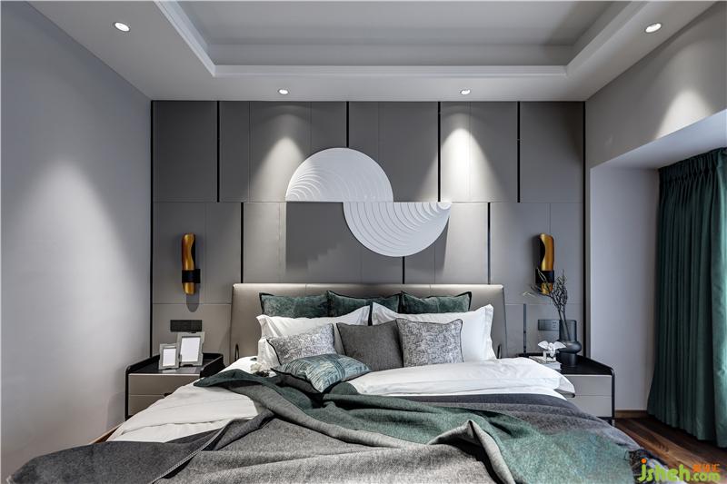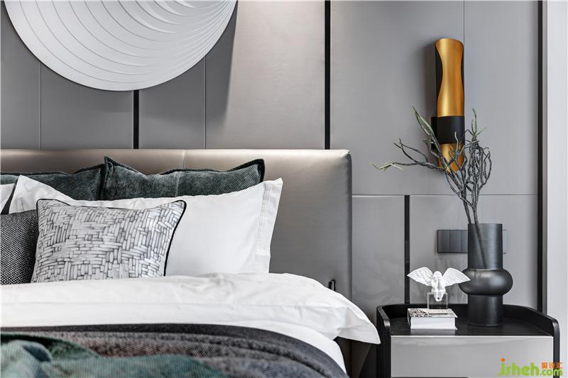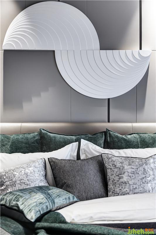 卧室恬静温润的气质,在高级灰背景里,映衬着一泓湖绿,让人陷入柔软舒适里感受一切令人欢喜的事物。