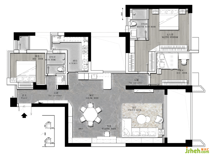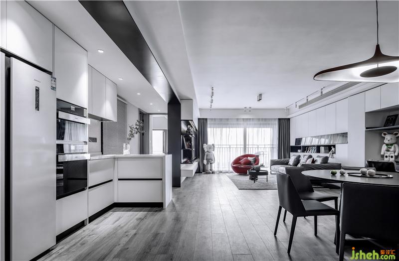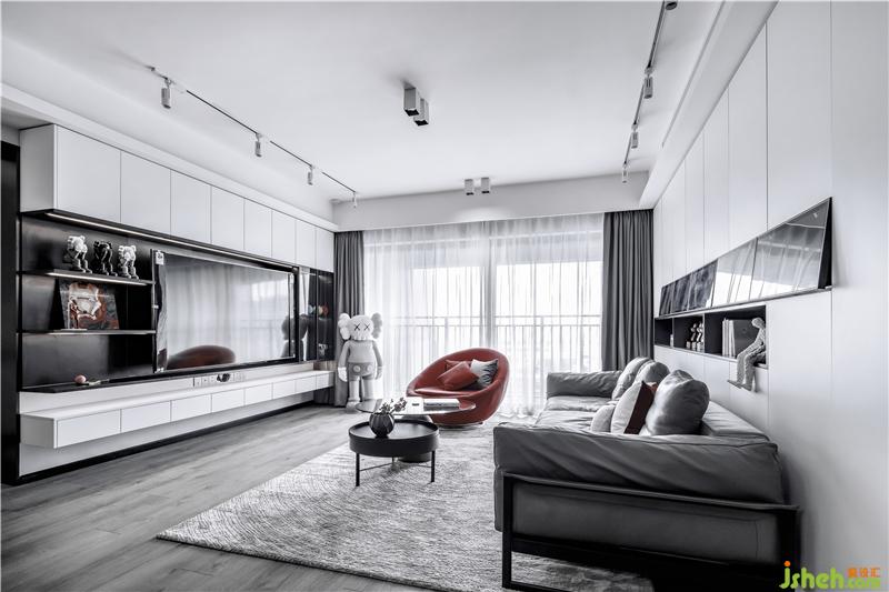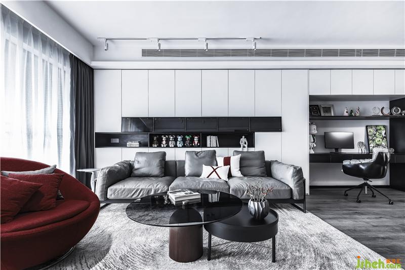 随八年时间变化的是城市、事业、家庭人口,以及对空间功能性和艺术性的要求,不变的是坚持生活的品质与仪式感。因此设计回归人文本质,室内设计师以现代简约为主题,选白、灰、黑色作主调,点缀红色,在视觉呈现上,散发着内敛优雅的底蕴;又不失惊喜,于平淡生活中,为家增添一抹亮色,即意指勇气与真诚,也象征着不会堙灭的热爱与理想。