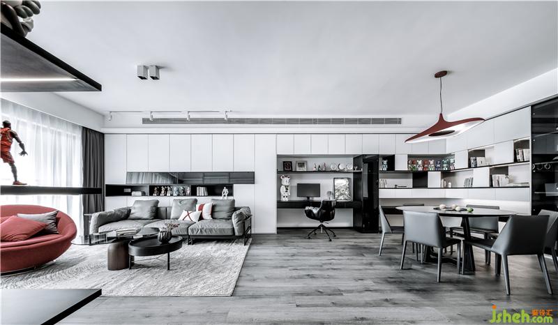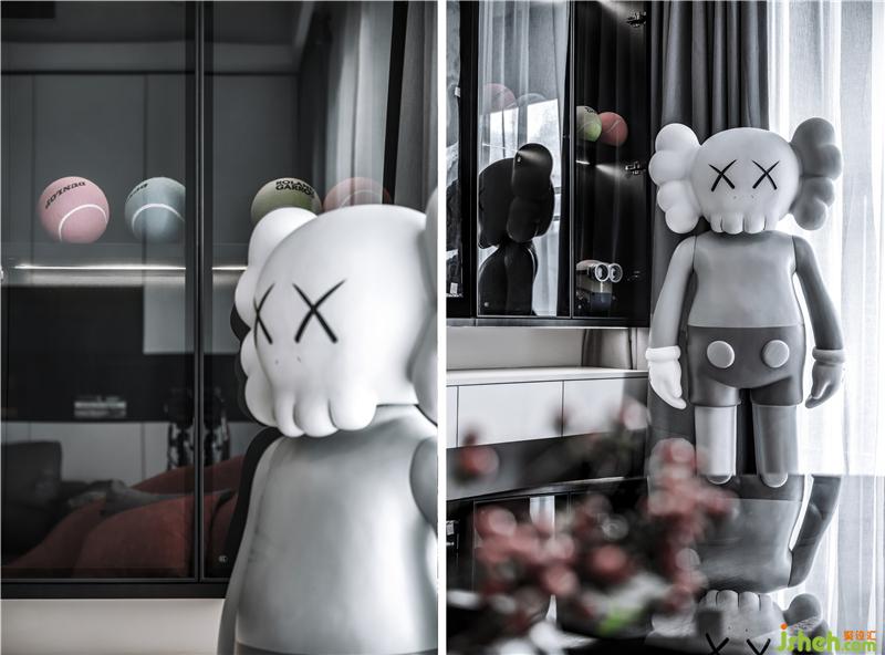 另一方面,如同灯红酒绿的都市中始终质朴的心,回归到室内,便成了纯然中夺目的红色、KAWS时尚元素和个性摆件,设计不会刻意的消匿城市亦现实对家庭的影响,这是室内设计师最希望的,因为那也是家庭的一部分,设计所强调的是平静安稳的空间氛围,生活品质与空间艺术,以及那象征着梦想的澳网网球。