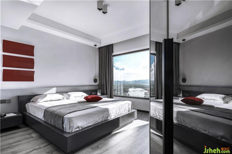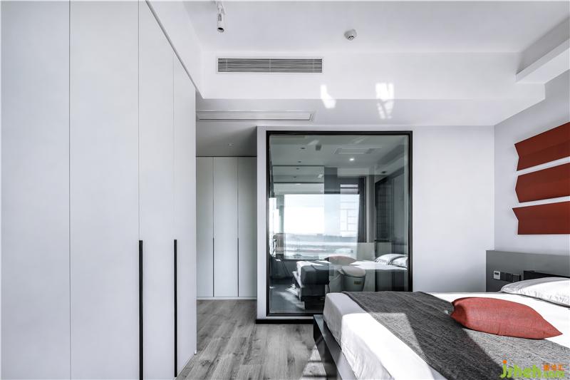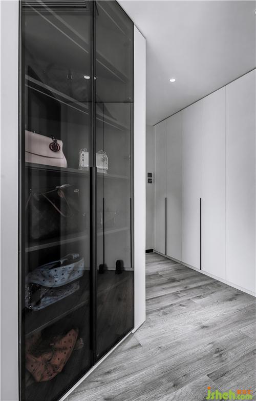 值得一提的是,斜面的柜体设计,在空间完美规避了直角形带给的不便与局限性,在功能上,还可以作为展示柜摆放女主人的奢侈品物件。连接白色的衣帽柜,为生活提供精致选择。