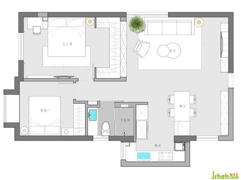 2.将厨房打开,并建一体化岛台餐桌,满足功能需求,形成连贯的使用性