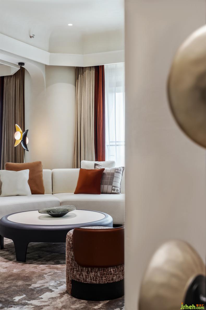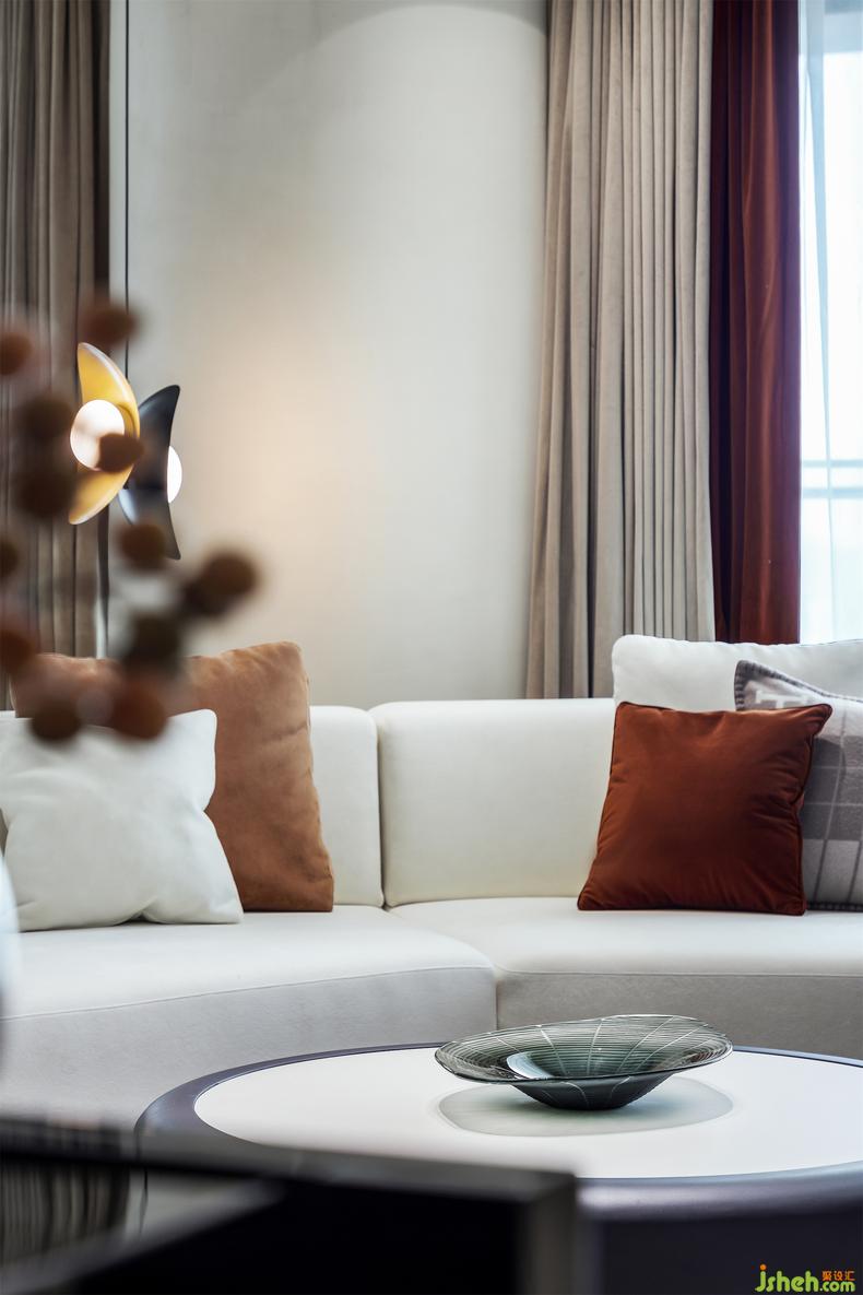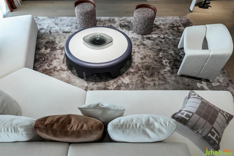 多边形的沙发搭配黑色边几,点缀爱马仕抱枕和延伸品牌最经典的大橘色系抱枕,深圳家居设计舒适的高级感最为令人着迷,再以圆形茶几、极具设计感的单人沙发协调,简约又给予丰富的享受。