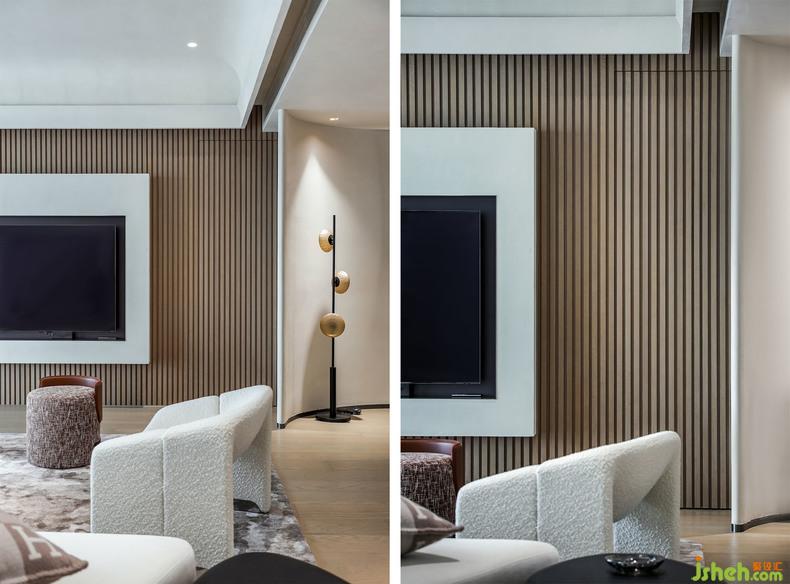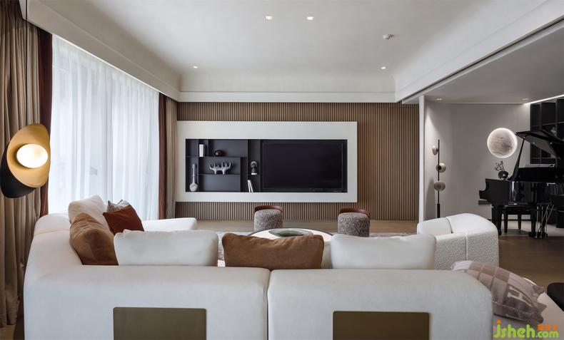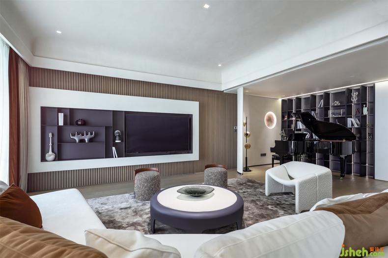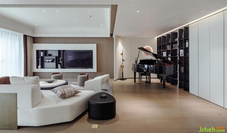 电视背景墙以黑白嵌入,摆满书籍或者放置一些艺术品,都尽显谦逊内敛,又对应着钢琴的优雅,充满了艺术的趣味。