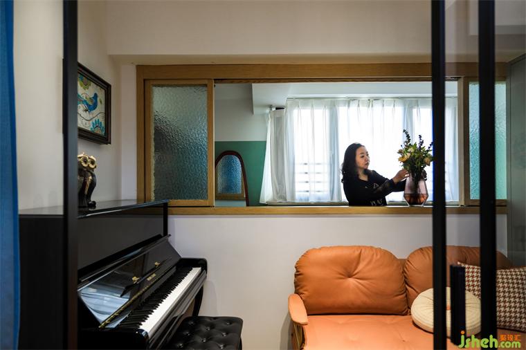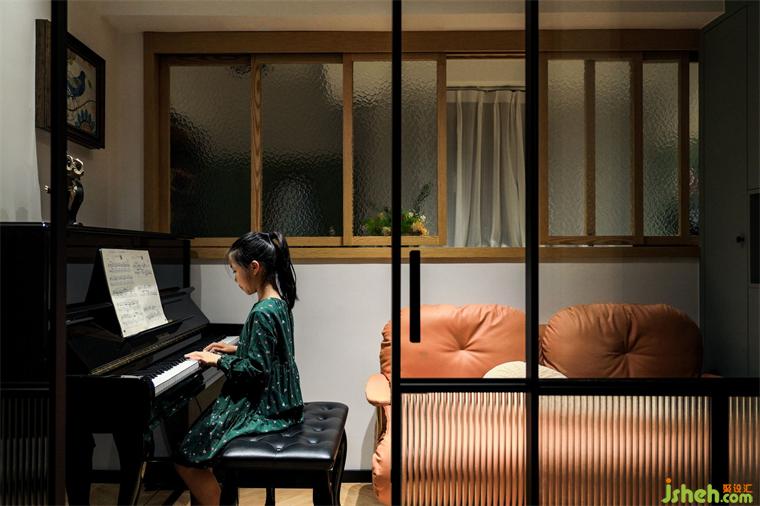 这个空间以前是客卧,没有光线,通风不好,现在改成半开放的琴房,木框窗从两面看,都像是把空间装在了一幅画里:《插花的女主人》、《练琴的孩子》,有时候发呆、阅读、休息,极具包容性和互动感。