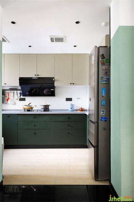 厨房的砖面、台面也保养的很好,旧房改造设计重新搭配了颜色,换了柜门,就这样简简单单,却充满力量。
