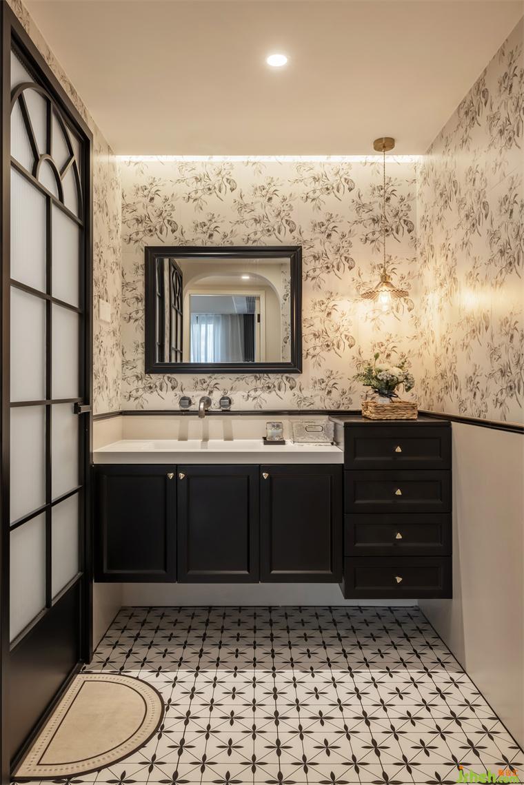 7.卫生间依旧实现了干湿分离布局,玻璃砖隔断划分出淋浴房,装修设计实现功能分区,可以有效避免水汽、潮气对家电设备的侵蚀,洗漱区更是整个房间中心动线的亮点,目光所及,皆是风景。