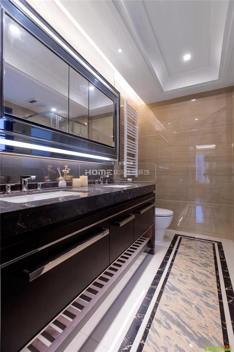 根据家人的生活习惯考量,主卫的色彩搭配和材料的使用风格都与整体相符,洗漱台的深色雅致玉石与浅色墙面碰撞出强烈的现代感,空间的功能安排,动线合理,梳理有度。