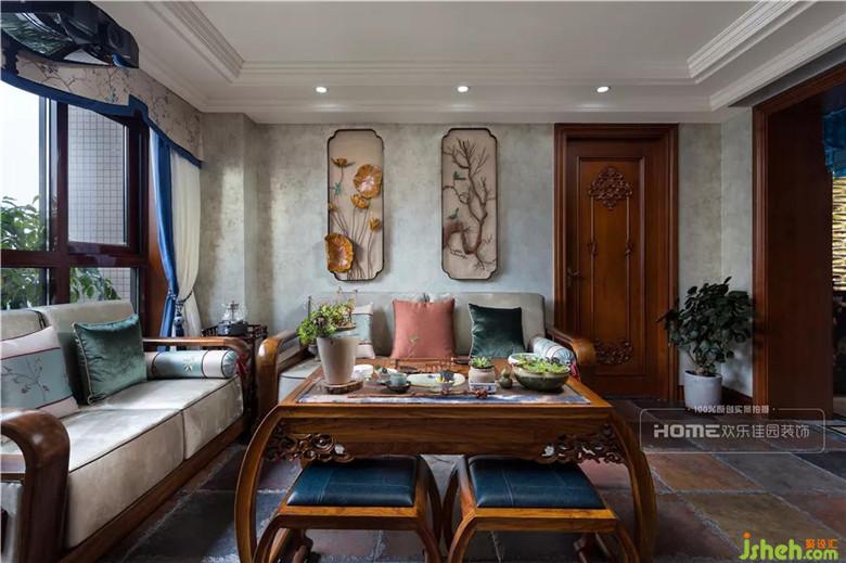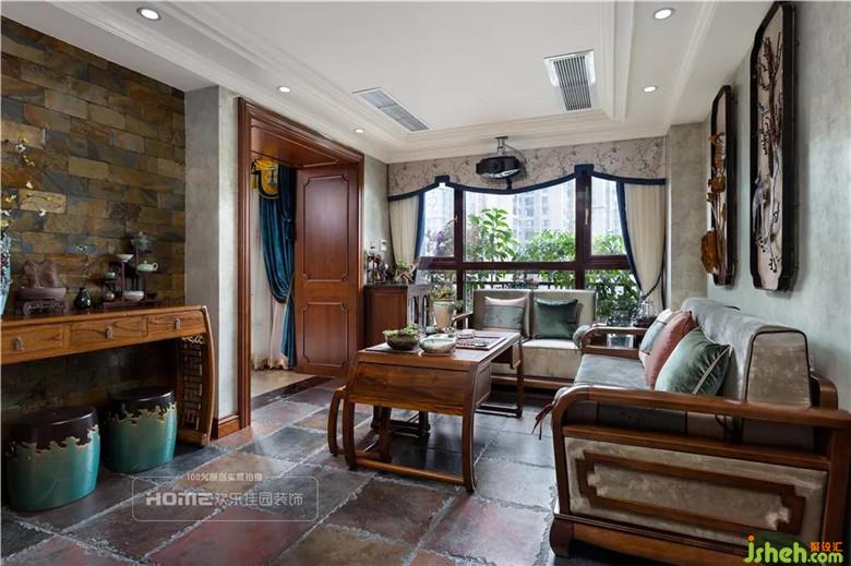 由于原始户型是双阳台,所以在户型改造上,设计师把内阳台设计为茶室,并加宽门套,保证空间整体的协调性,同时满足H先生的需求。