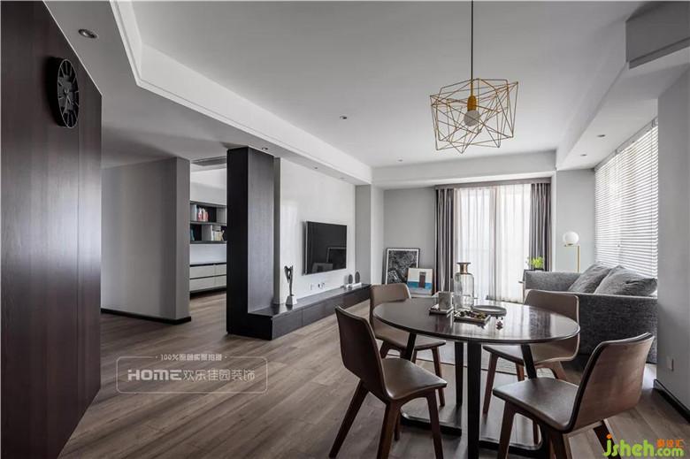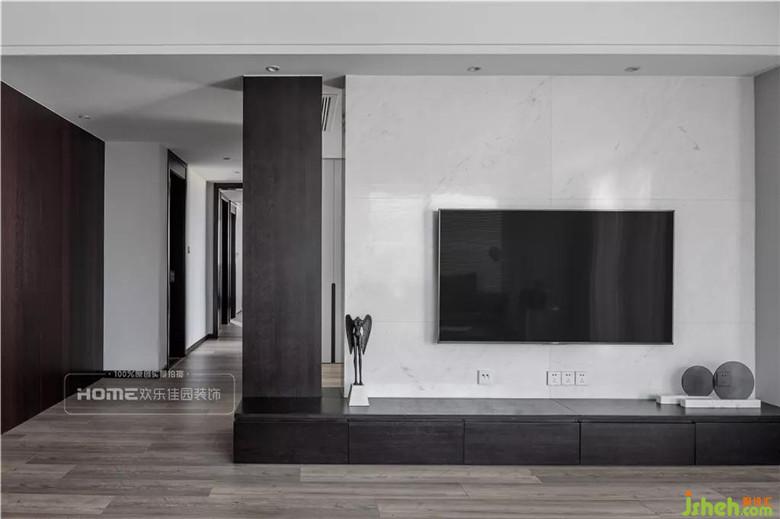 在客厅的布局上,设计师巧妙的利用电视墙体与书房的局部相结合,镂空的设计,形成一种连续延伸的轴线,同时也让整个空间在视觉上更加宽阔。