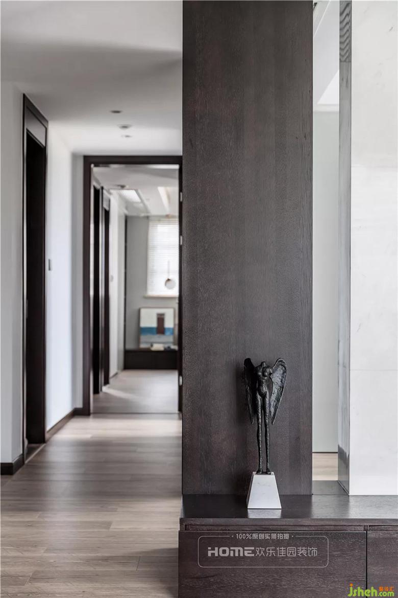 设计师将尖锐的墙角去掉,化整为零,循序渐进,将冰冷的墙砖转变成温度、质感的镂空木饰面板,这也是整套案例的亮点之一。