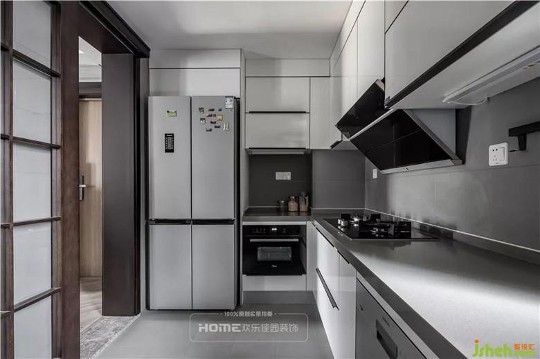 L型厨房布局,由原厨房和生活有阳台打通合并而成,利用L型转角的设计很好的节省空间,洗、切、炒完美的操作区域,流水线的整体设计,便利又美观。