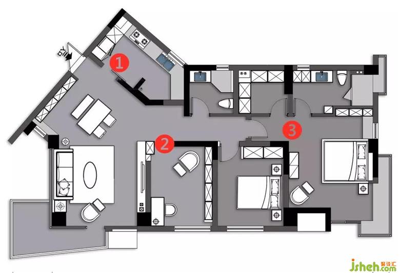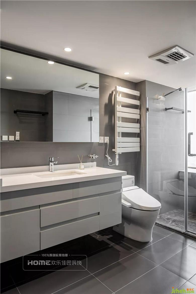 卫生间在颜色上奉行一贯的素色,灰白相间,干湿分离,“脏处尤需显洁,臭地更应芬芳”,体现了一种互补的设计原则。