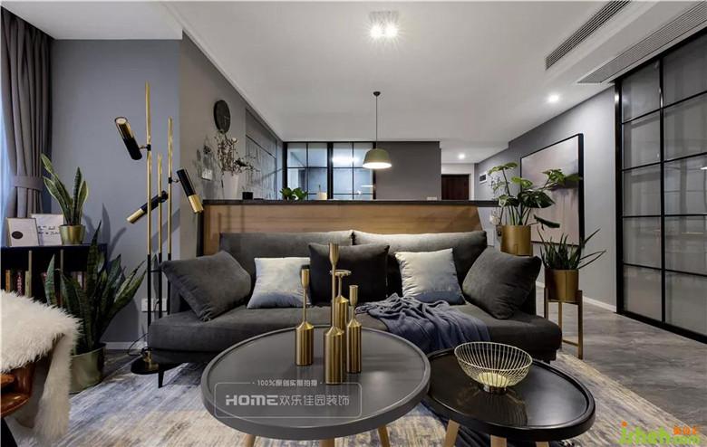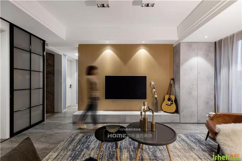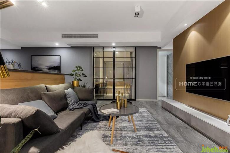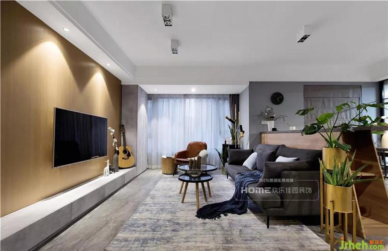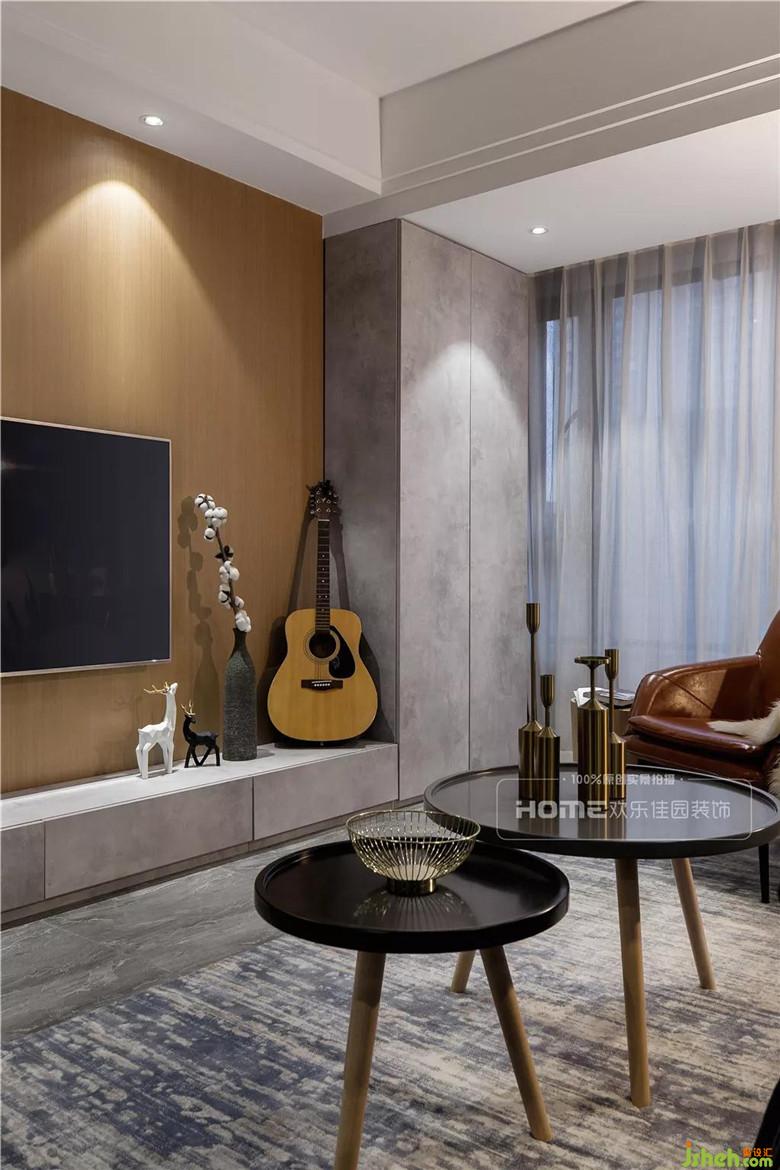 整体空间以灰色为主色调,局部原木色相映衬,加之金属质感软装进行渲染,不单一不复杂。电视背景墙设计成实木墙板,木质的温度与质感,更好的起到柔化空间氛围的作用,提升整体家居的档次。