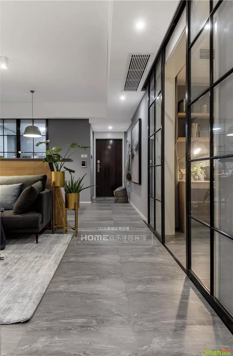 将客厅旁边的房间隔墙拆除,使得进入室内空间的采光和通风到达最佳效果,设计外挂的双推黑框门,缓解过于常规的过道墙面,增加空间的连贯性与延续性。