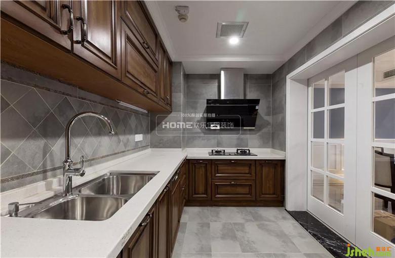 开敞的具有美式风的厨房,具备强大而又简单耐用的厨具设备,有宽敞和足够的操作台面,在装饰上也有很多小细节,仿古墙砖,厨柜门板喜好用实木门扇。
