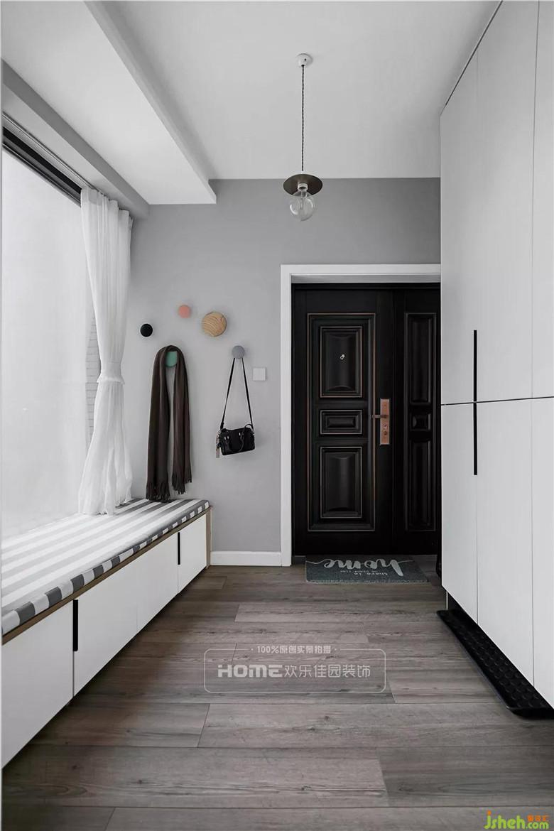 玄关区域宽敞明亮,空气与光线的自然流通,靠窗的一面,设置低矮的收纳柜,一举两得,既可以放置日常生活品,也可以坐下换鞋;靠墙的一面设置储物柜体,充分利用空间设计满足家人的收纳需求。