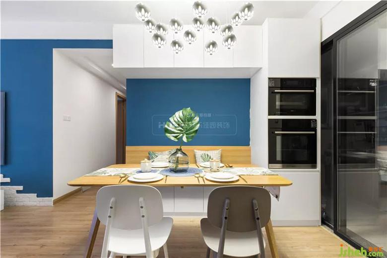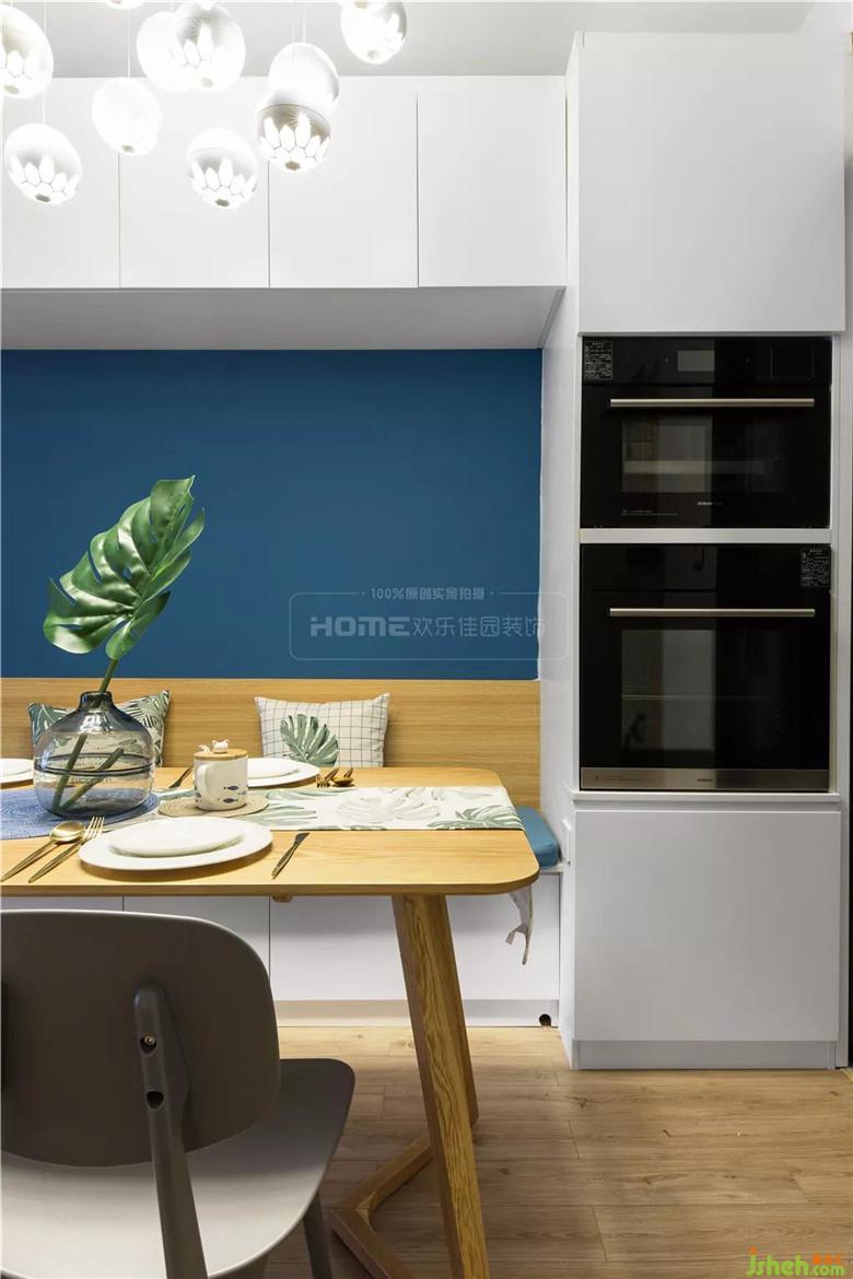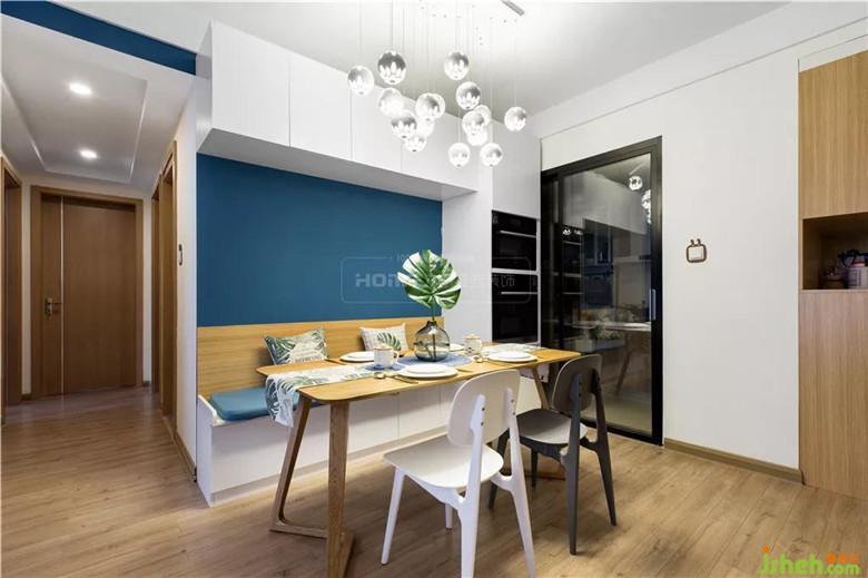 为了使空间整体化,餐厅背景色的运用与客厅保持一致,靠墙的位置,设计师根据空间尺寸,墙面的高度设计了卡座餐桌,即便在家也能享受别样风情。