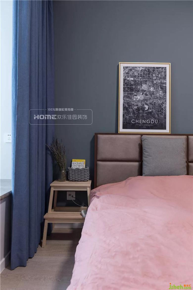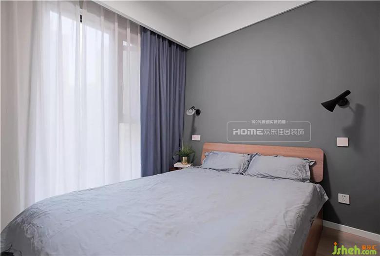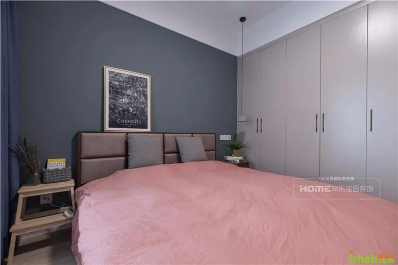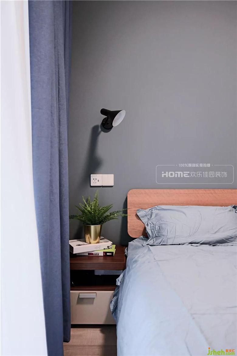 次卧墙体向客厅区域外移120公分,增加了一个常规床头柜和储物柜的长度,通过改变次卧结构来满足小卧室的储物问题,以简单的浅灰色打底,渲染出随遇而安的居住氛围。